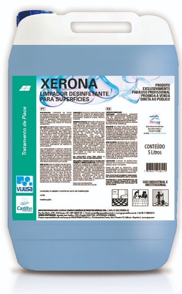 Detergente neutro concentrado altamente perfumado que limpa, desengordura, abrilhanta e desinfeta de forma energética pisos, azulejos, cerâmicas, vidros, louças e metais sanitários. Indicado para indústrias, hotéis, escolas, edifícios e veículos. Proporciona acabamento impecável, duradouro e deixa o ambiente agradavelmente perfumado. Devido a sua particular composição que lhe confere um caráter altamente seletivo, bem como a ausência de agentes químicos agressivos em sua formulação, Xerona é muito adequado na limpeza de superfícies delicadas. Produto reconhecido e apreciado no mercado mundial.