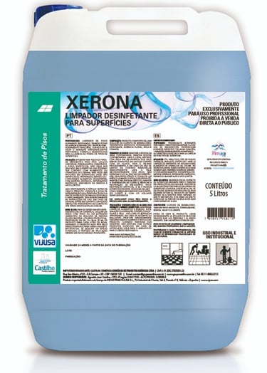 Detergente neutro concentrado altamente perfumado que limpa, desengordura, abrilhanta e desinfeta de forma energética pisos, azulejos, cerâmicas, vidros, louças e metais sanitários. Indicado para indústrias, hotéis, escolas, edifícios e veículos. Proporciona acabamento impecável, duradouro e deixa o ambiente agradavelmente perfumado. Devido a sua particular composição que lhe confere um caráter altamente seletivo, bem como a ausência de agentes químicos agressivos em sua formulação, Xerona é muito adequado na limpeza de superfícies delicadas. Produto reconhecido e apreciado no mercado mundial.